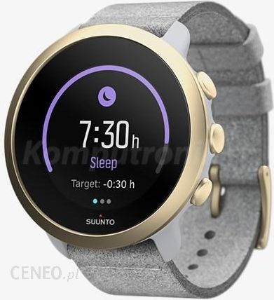 Suunto 3 Pebble White Light Gold Wrist HR to mutifunkcyjny, wytrzymały zegarek fińskiej marki z możliwością korzystania z GPS poprzez telefon komórkowy. Koperta o średnicy 43mm została wykonana z ABS, natomast pierścień z wysokiej jakości stali nierdzewej odpornej na rdze oraz o właściwościach antyalergicznych. Kolorowy wyświetlacz zabezpieczony szkłem polamidowy pozwoli na przejrzysty odczyt. Zegarek został zawieszono na szarnym pasku z tkaniny z mikorfibry, która dobrze przylega do każdej wielkości nadgarstka. Zegarek posiada łączność w Technologia Bluetooth Smart, co pozwala na otrzymywania powiadomień z telefonu czy mozliwości kompatybilność z aplikacjami takimi jak np. Endomondo. Suunto 3 Pebble White Light Gold Wrist HR oferuje nadgarstkowy pomiar tętna, licznik kalorii, kroków, monitorowanie ogólnego poziomu aktywności w ciągu dnia czy monitorowanie snu. Oprócz tego posiada też sportowe kompetencje jak bieganie, rower, pływanie, fitness, siłownia. Wodoszczelność na poziomie 30m pozwala na swobodne pływanie w zegarku na ręku.